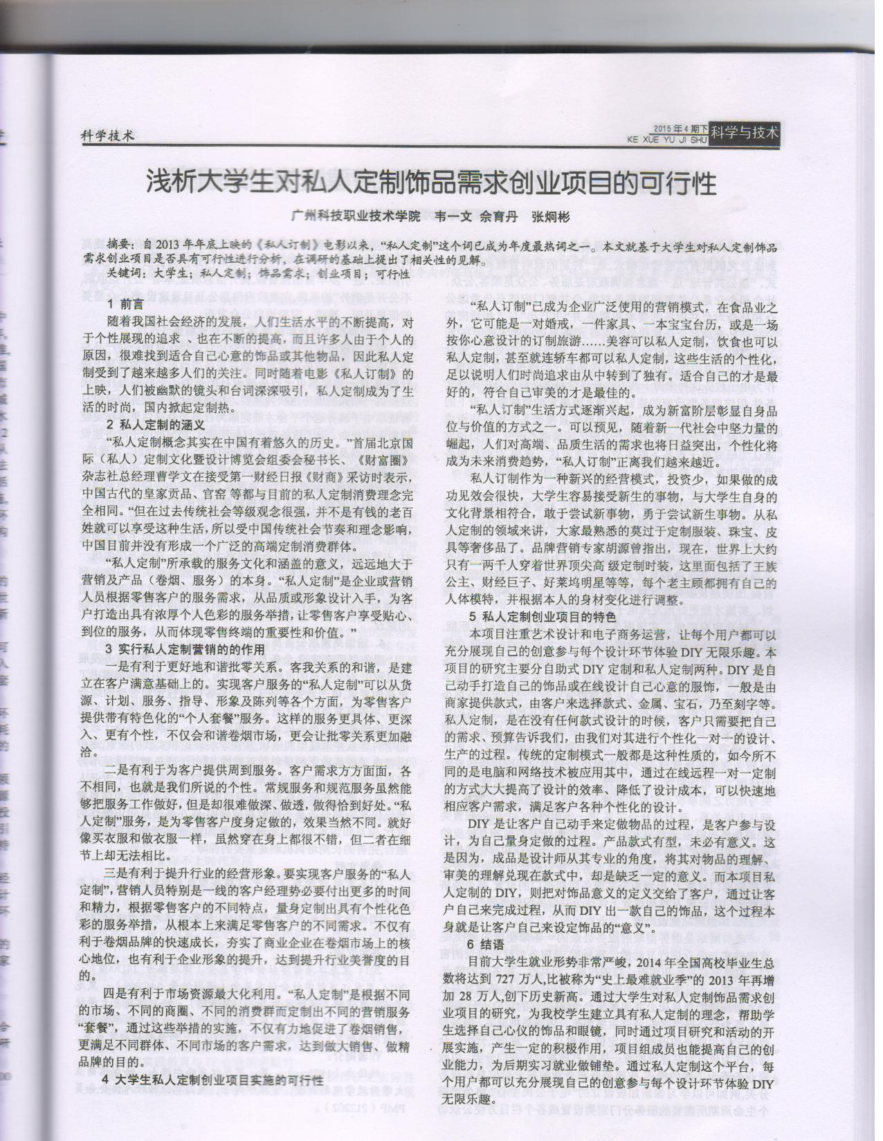 1.【发表论文】浅析大学生对私人定制饰品需求创业项目的可行性