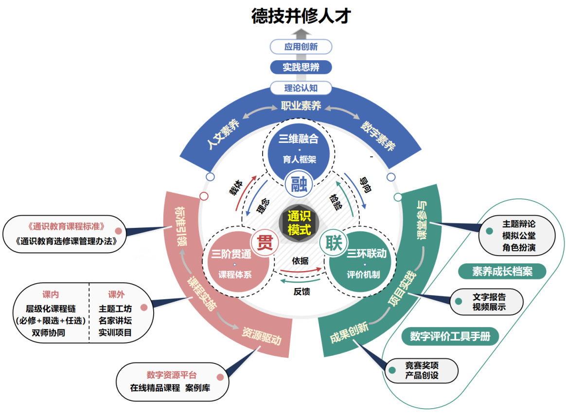 提出“职业素养+人文素养+数字素养”融合目标,构建“理论认知—实践思辨—应用创新”三阶培养路径,打破技能与素质培育分离的固有模式。以工匠精神、职业道德等职业核心素养为价值导向,将通识教育有机融入人才培养全过程,推动职业性与通识性在目标、内容与场景上的统一与融合。面向人工智能时代,创新设计“数字素养赋能”实施路径,通过数字技术革新通识教育方式,彰显现代职业教育类型特色。