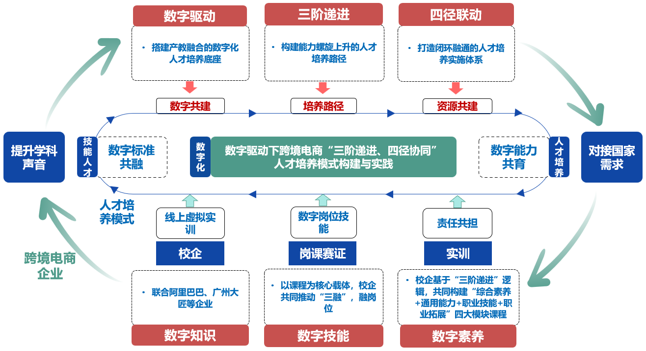 党的二十大报告首次将“推进教育数字化”写入党代会报告,为职业教育数字化转型提供根本遵循。作为粤港澳大湾区跨境电商数字化育人先行者,学校依托阿里巴巴跨境电商人才培育基地、阿里巴巴国际站数字贸易人才基地及2项省级项目,聚焦产业数字需求与教学适配不足、课程迭代滞后于跨境电商技术发展、技能型人才供给与企业紧缺需求脱节三大核心痛点,沿“数字化载体搭建→数字能力阶梯培养→数智化协同育人”路径深耕多年,创新构建起“数字驱动・三阶递进・四径协同”的跨境电商人才培养体系,形成覆盖“底座搭建-路径设计-体系落地”的完整育人框架(见图 1),实现教育链、人才链与产业数字链的深度融合,有效破解人才培养与产业发展脱节难题,为区域跨境电商产业数字化转型提供高端技能人才支持。