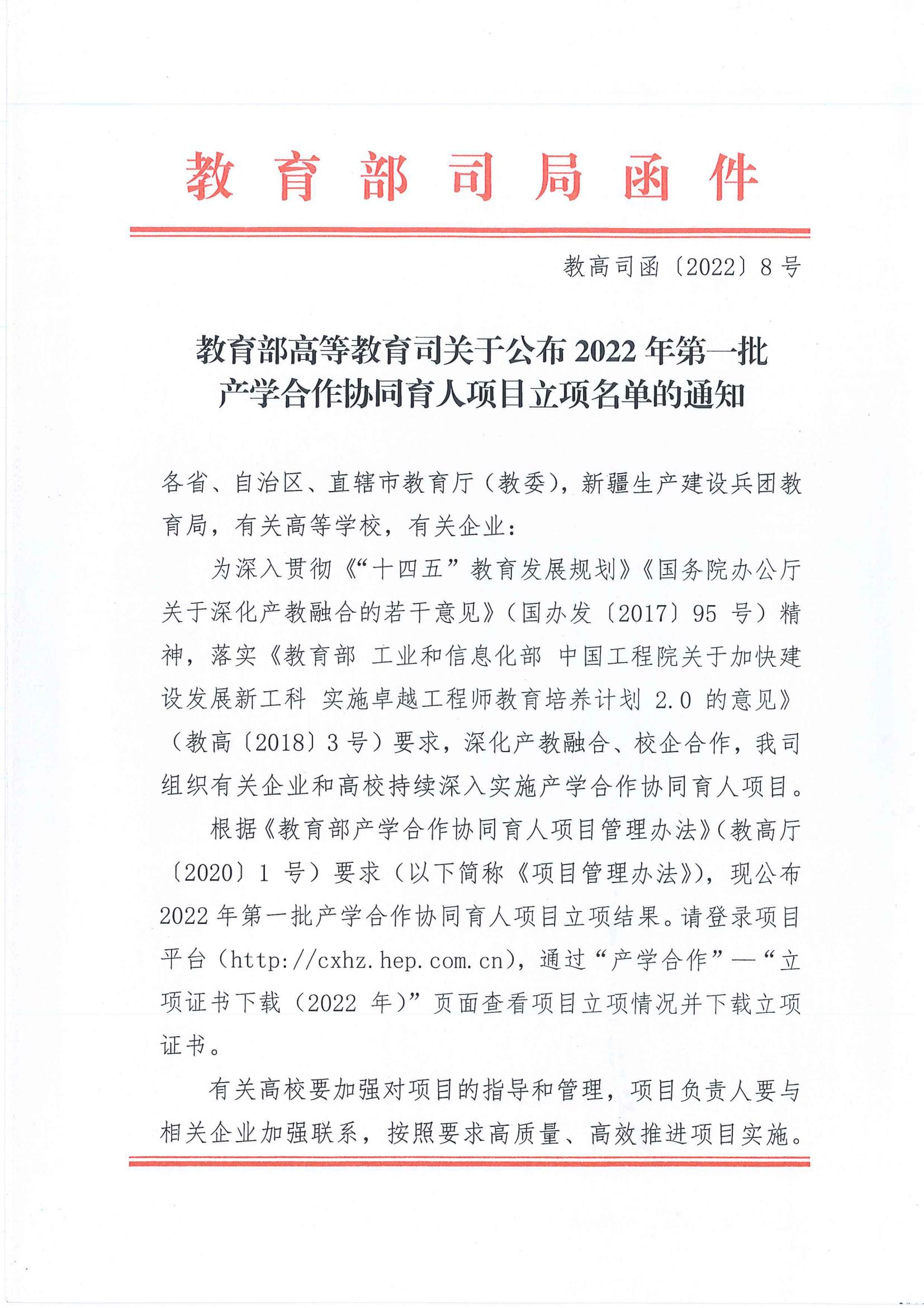 教育部高等教育司关于公布2022年第一批产学合作协同育人项目立项名单的通知.pdf