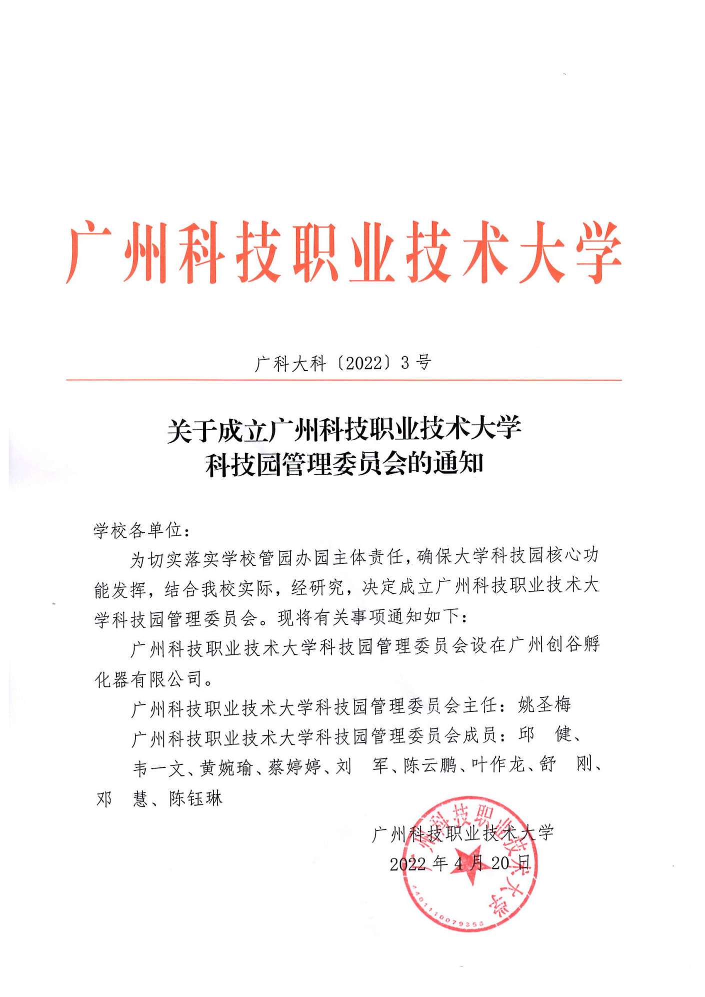 广州科技职业技术大学关于成立大学科技园管理委员会的通知
