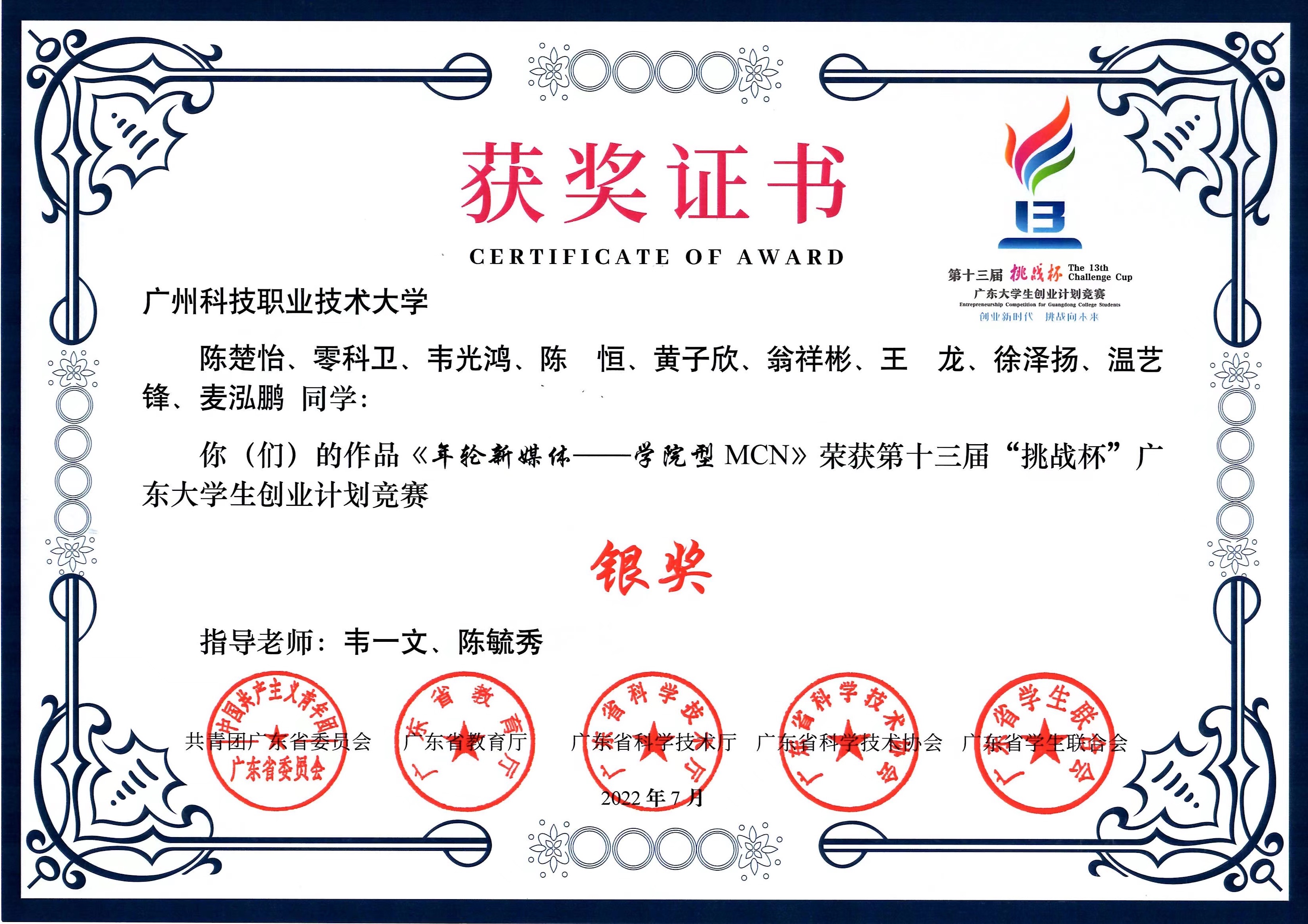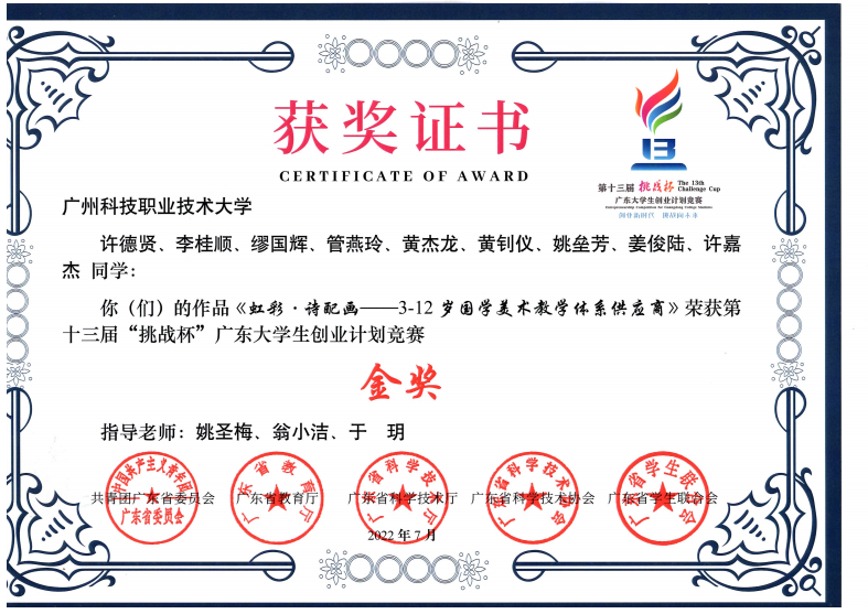 学校领导高度重视创新创业工作,为进一步做好创新创业大赛指导与备赛工作,安排了多场线上线下结合的专题辅导讲座,为大赛的备赛工作给予了充分支持。我校参赛项目“虹彩·诗配画—3-12岁国学美术教学体系供应商”和“年轮新媒体—学院型MCN”分别荣获第十三届“挑战杯”中国大学生创业计划竞赛金奖和银奖!两个项目团队克服困难、积极备赛,在广州科技职业技术大学指导老师们的带领下对各自项目进行细致的打磨。经过大家的共同的努力,最终取得了本次优异成绩。