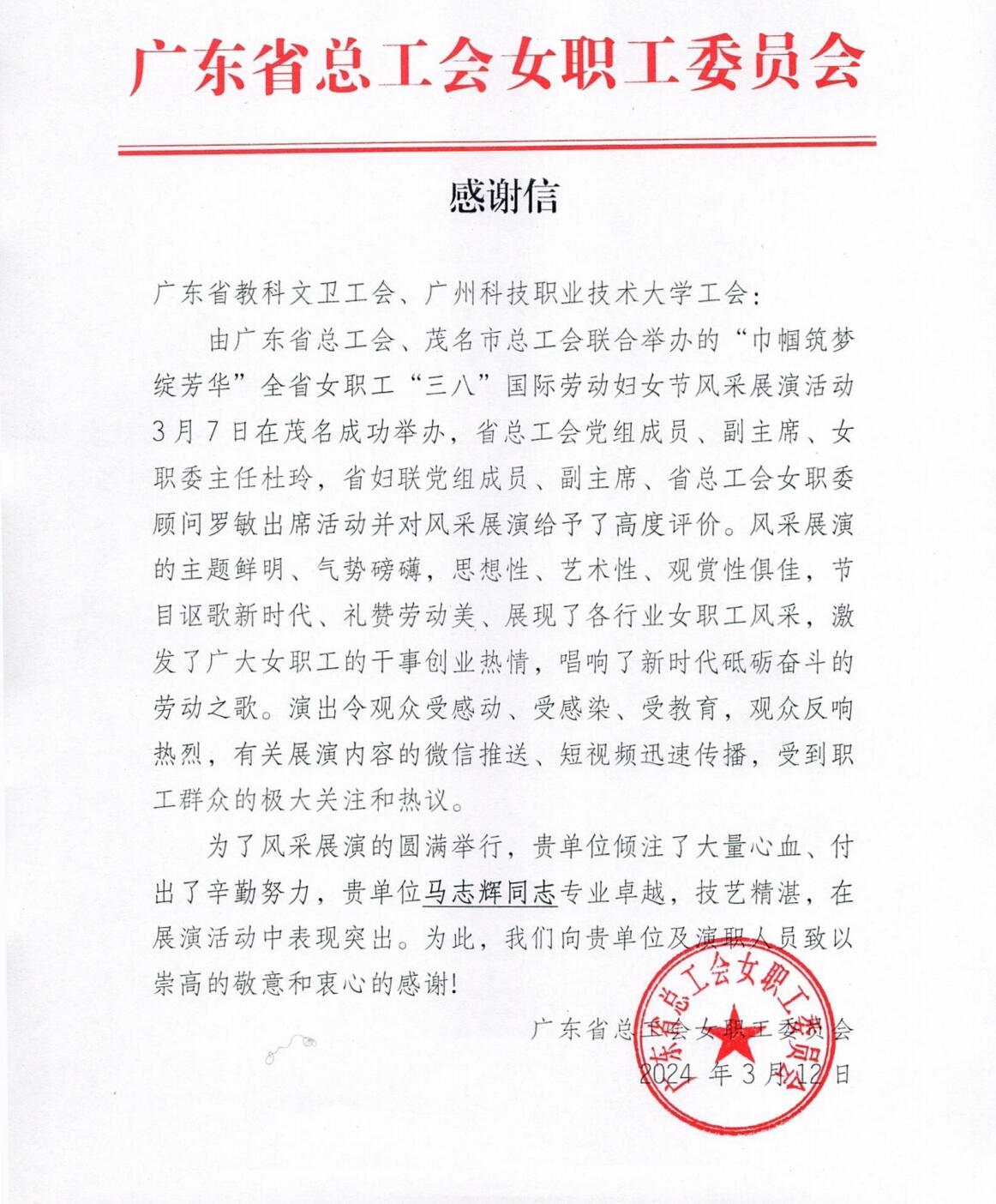 学校工会副主席、艺术团团长马志辉老师带领工会及艺术团成员代表广东省教科文卫工会、广州科技职业技术大学工会前往茂名赴会参加此次“巾帼筑梦绽芳华”广东省女职工“三八”国际劳动妇女节风采展演活动。