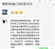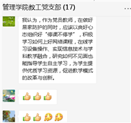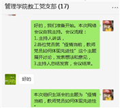 2020年2月27日晚, 管理学院教工党支部召开支部组织生活会。本次会议主题为“疫情当前,教师党员如何体现先进性”。由于当前处于新冠肺炎疫情期间,支部成员不能当面开会,因此利用网络和支部微信群召开了别开生面的一次网络会议。本次参会的党员为教工支部全体在岗党员。会议由支部书记谢晓冲主持。