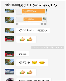 2月29日当日谢书记和两位委员商议之后,立即起草了《关于教工党员响应党中央号召,自愿为支持新冠肺炎疫情防控工作捐款的倡议书》这份倡议书。谢书记将此倡议书和相关想法向管理学院党总支刘静书记请示和汇报,并按照刘书记一些意见和建议来安排组织动员工作。3月1日谢书记将倡议书发到支委会,与两位委员交流意见。并安排组织委员王艳华老师负责草拟通知,并发布到党员微信息群;宣传委员陆源老师负责接收捐款并做好登记统计和按时向管理学院党总支刘书记汇报捐款活动进展。