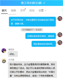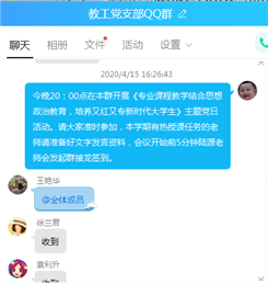 4月15日,正值国家安全教育日,管理学院教工党支部利用支部QQ群顺利开展了4月份的主题党日活动。本次会议的主题是“专业课程教学结合思想政治教育,培养又红又专新时代大学生”。会议的主要内容是围绕专业教学工作和思想政治教育、安全教育相结合的主题,让本学期有授课任务的党员老师就如何在教学工作中增强师生的思想政治素质、安全意识等问题进行讨论交流。会议由支部书记谢晓冲主持。参加会议的人员不仅包括组织关系在学校的党员,还包括流动党员以及一名刚被确定为入党积极分子的教师。