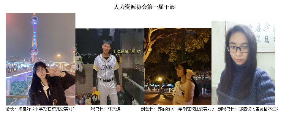 人力资源协会第一届轮值指导老师彭彦老师毕业于胡安卡洛斯国王大学,第一届学生核心干部为:会长陈键好、副会长苏丽敏、秘书长林文涛、副秘书长郑洁仪,目前协会注册程序顺利进行中。