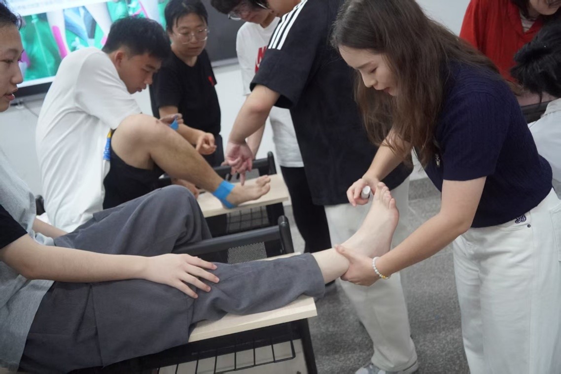 本次讲座的核心实践教学环节,罗医生带领同学们深入探索踝关节损伤处理技术,解释了大部分踝关节损伤为外侧韧带损伤的关键原因,随后手持肌贴、弹性绷带、白贴等工具,一边细致讲解材料特性,一边通过给学生示范,将“8字固定法”和肌贴固定的每一个步骤拆解演示,从绷带缠绕的方向、力度,到肌贴剪裁的角度、贴扎位置,每个细节都讲解得通俗易懂。