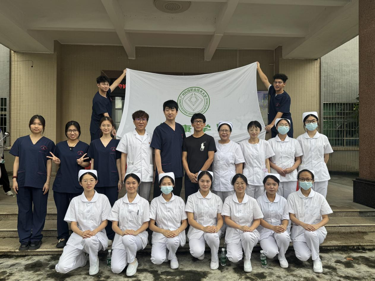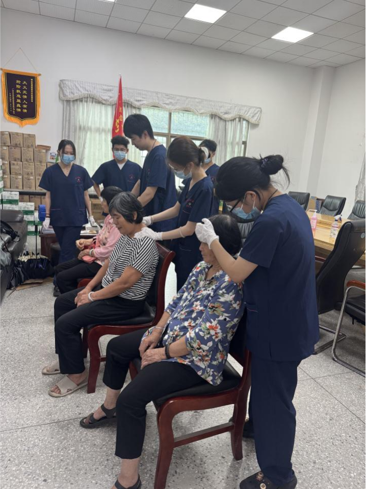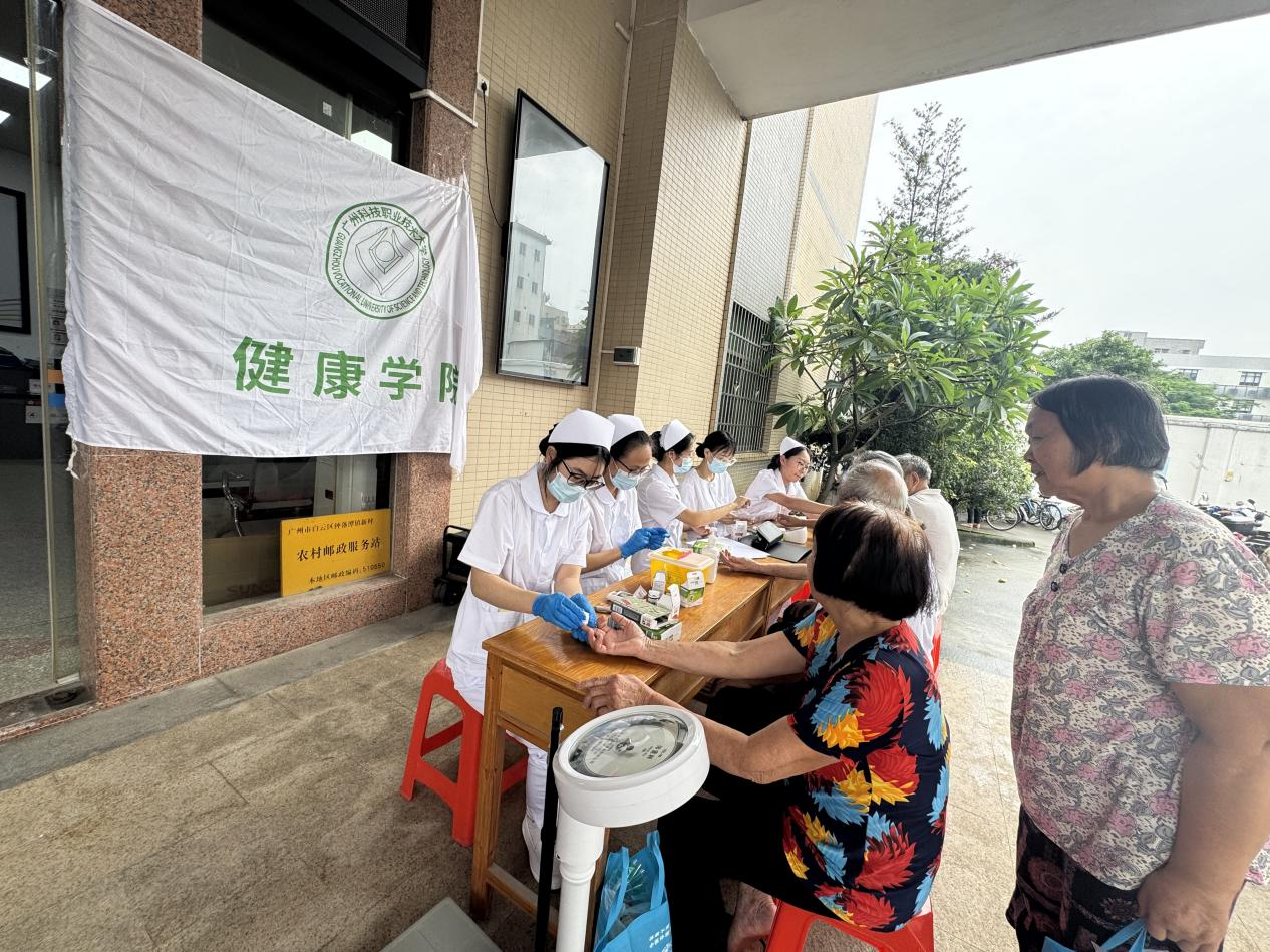 2025年6月18日,上午9时,健康学院刘琼玲院长带领基础医学教研室主任葛华老师、护理教研室副主任罗素珍老师、康复治疗教研室周星宇老师及14名护理、康复治疗专业入党积极分子学生共18人赴钟落潭镇新村村开展“专业赋能,社区同行”送健康服务。