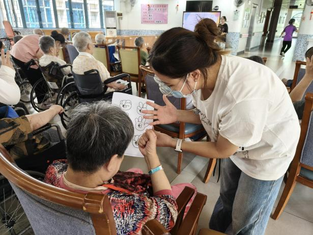 在教导健康手指操环节,志愿者们耐心细致,一边说着口诀一边做着示范,老人们学得有模有样,有些老人们害羞腼腆,在志愿者们的鼓励下,逐渐放开手脚开始跟着志愿者们一起做了起来。现场还有志愿者为老人们进行简单的益智小游戏,比如颜色拍拍、拍拍乐等,互动过程中,志愿者们在现场引导着老人们如何完成游戏,有志愿者们的赞扬声,有老人们完成游戏的快乐的笑声,还有社工、护士们对这次活动肯定的声音,整个活动现场充满了欢声笑语,温情四溢,志愿者们用自己的行动为老人们带去了温暖和陪伴,也让老人们感受到了社会的关爱和尊重。我们志愿者这次传递出的不仅是温暖,更是一份浓浓的关爱与陪伴。