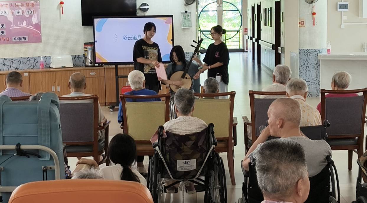 活动当天,志愿者们分组行动,同时进行活动,力求能够实现“心贴心交流,实打实服务”,每位志愿者各自陪伴一到两位老人,有的陪老人们聊天攀谈,倾听他们的人生故事;有的协助工作人员整理活动现场;文艺表演环节中,陈灿同学用中阮表演《彩云追月》,引得现场的老人们拍手叫好,郭芷晴、黄昊阳同学在经典歌曲合唱《我只在乎你》《顺流逆流》《万水千山总是情》《我和我的祖国》引发全场老人们的共鸣,有的老人们跟着节奏轻轻哼唱,笑容洋溢,有的还上场跟志愿者们一起合唱,氛围其乐融融。