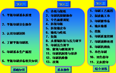 1 | 平版印刷基本常识 | 平版印刷基本常识主要介绍平版最基本的一些知识、胶印术语与安全教育、实训管理制度等,为后续模块实训打下基础。 |