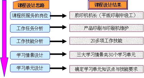 工作岗位分析:胶印机操作岗是印刷技术专业的核心岗位之一,按职责与能力的不同可分为多色机机长、单色机机长、胶印机二手、胶印机三手、胶印机四手、胶印机学徒等子岗位,按职业等级可分为初级工、中级工、高级工、技师与高级技师。本课程的培养目标定位在平版印刷中级工级别,岗位定位为单色机机长、多色胶印机二手,能力定位在能独立操作单色胶印机完成单色印刷品的印刷任务或者在多色胶印机机长的带领下协助机长完成多色印刷品的印刷任务。