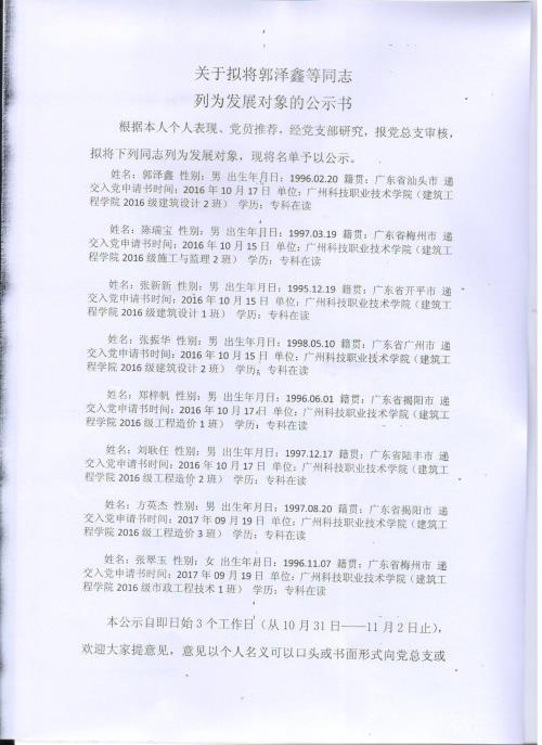 关于拟将郭泽鑫等同志列为发展对象的公示