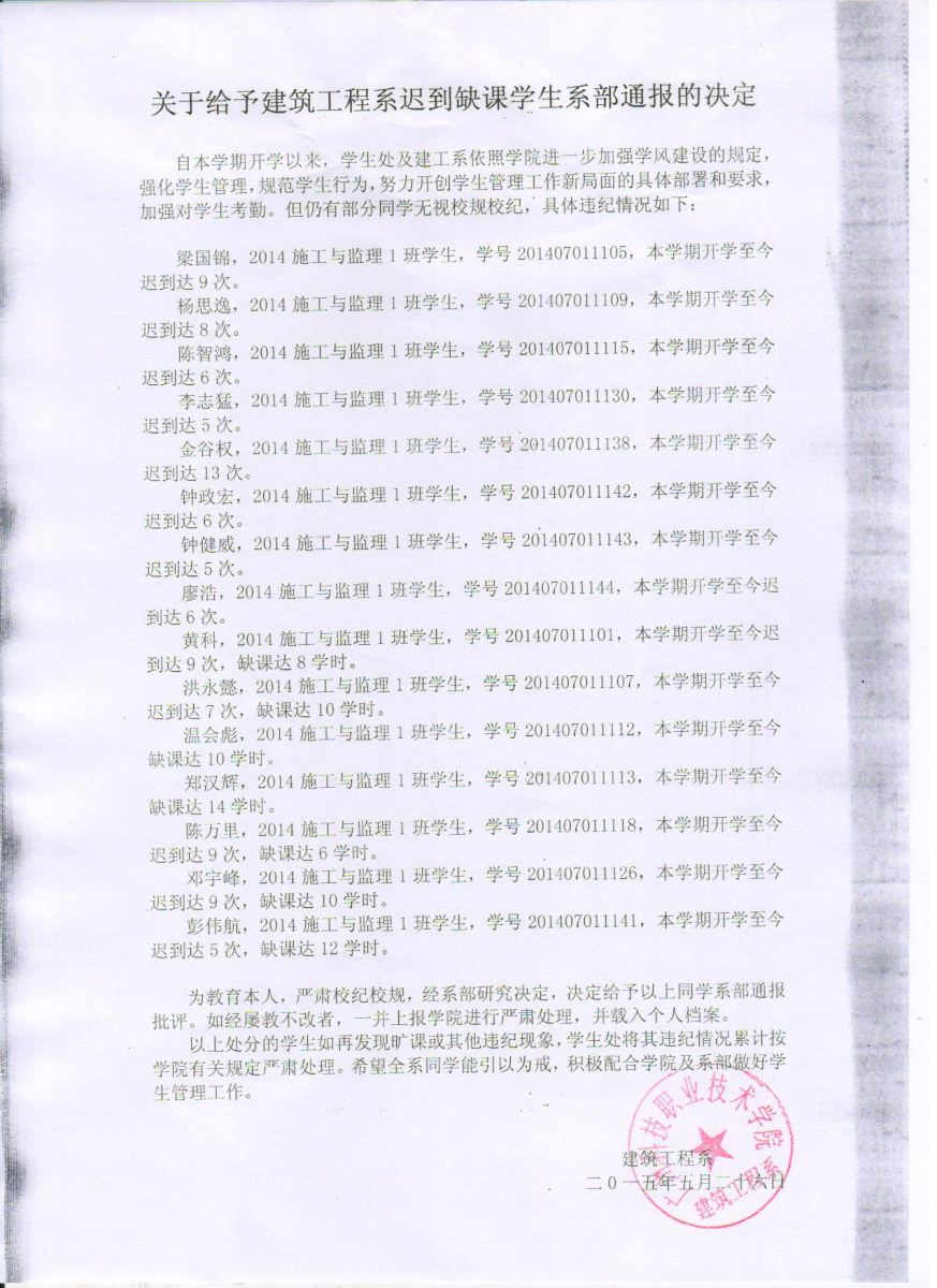 关于给予建筑工程系迟到缺课学生系部通报的决定