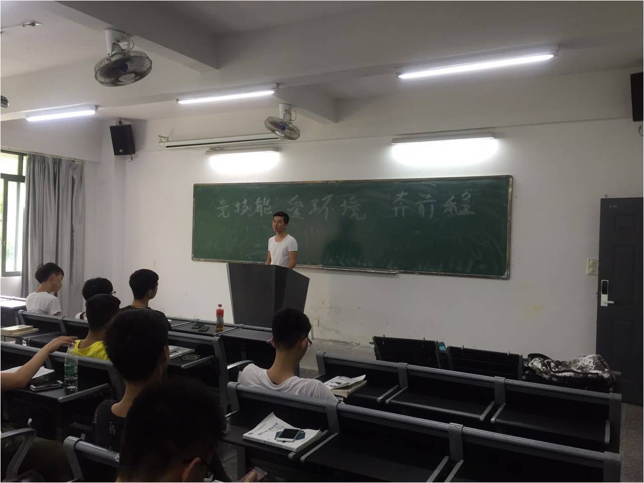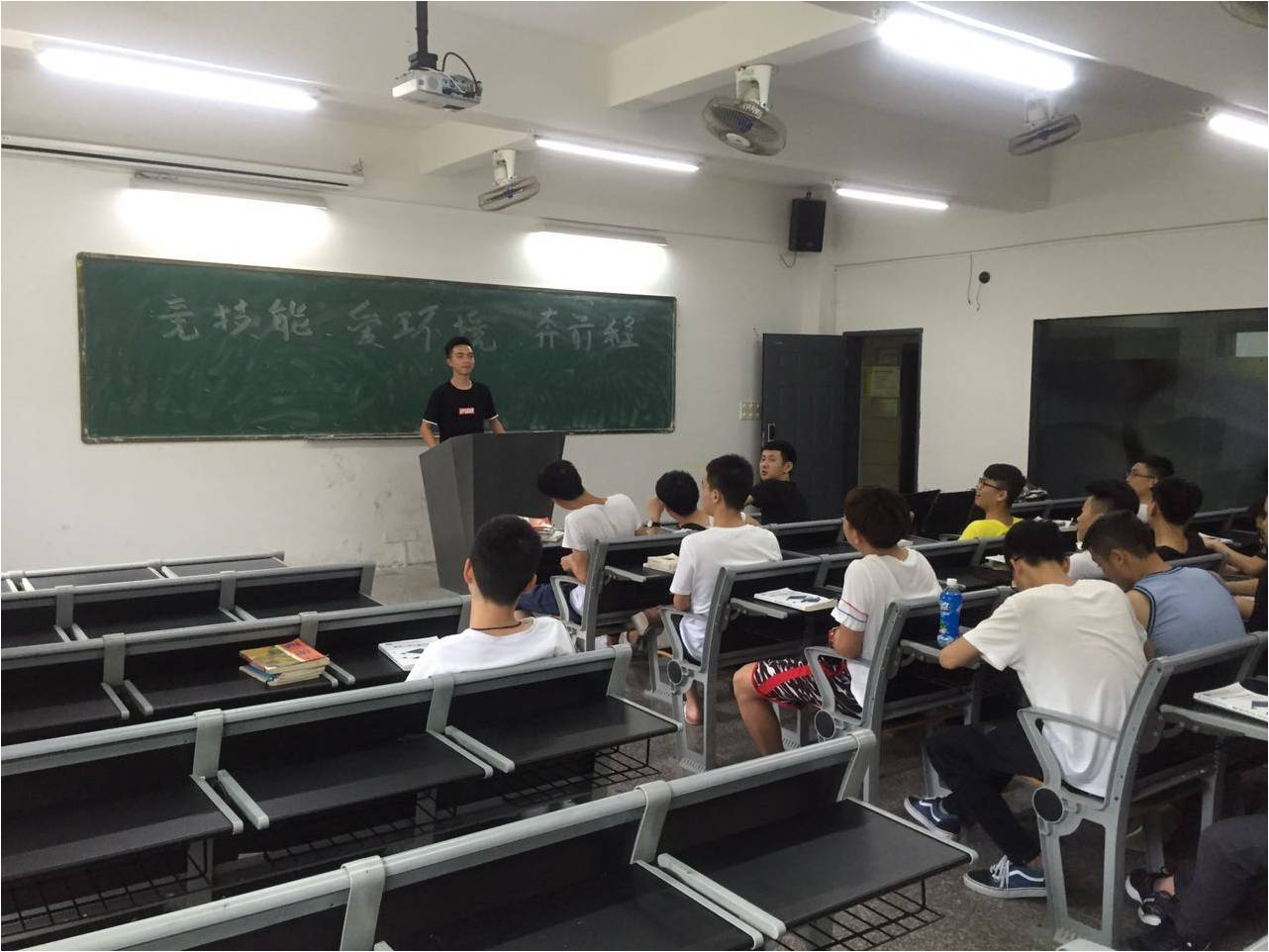 2017年6月6日下午3点45分,15施工与监理2班在2203教室开展了一场名为“竞技能、爱环保、奔前程”的主题班会,主讲人为许铎彬、冯叶苗、梁志华。