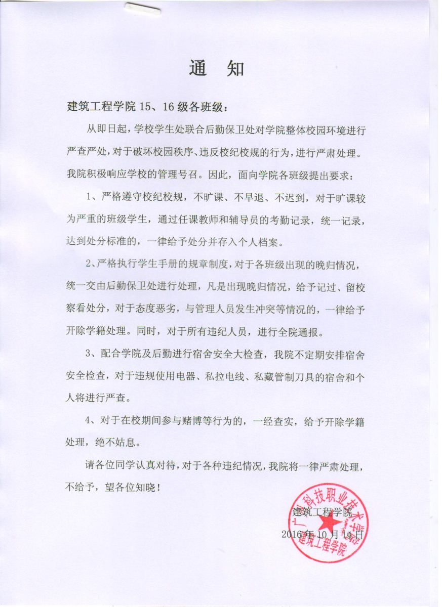 从即日起,学校学生处联合后勤保卫处对学院整体校园环境进行严查严处,对于破坏校园秩序、违反校纪校规的行为,进行严肃处理。我院积极响应学校的管理号召。因此,面向学院各班级提出要求: