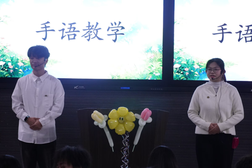 活动伊始,主持人以热情洋溢的语调,为活动拉开序幕。首先,展示了来自兄弟院校的祝福视频;接着,点明手语交流的重要性及本次活动的主旨,校青志会长团成员王佳熙发言并强调手语作为心灵密码的价值,呼吁大众关注听障群体。随后,校青志手语队表演《追光者》《推开世界的门》,以无声演绎获现场掌声。