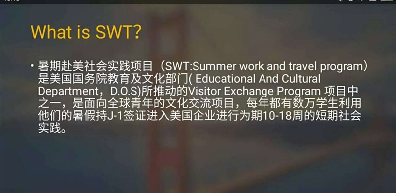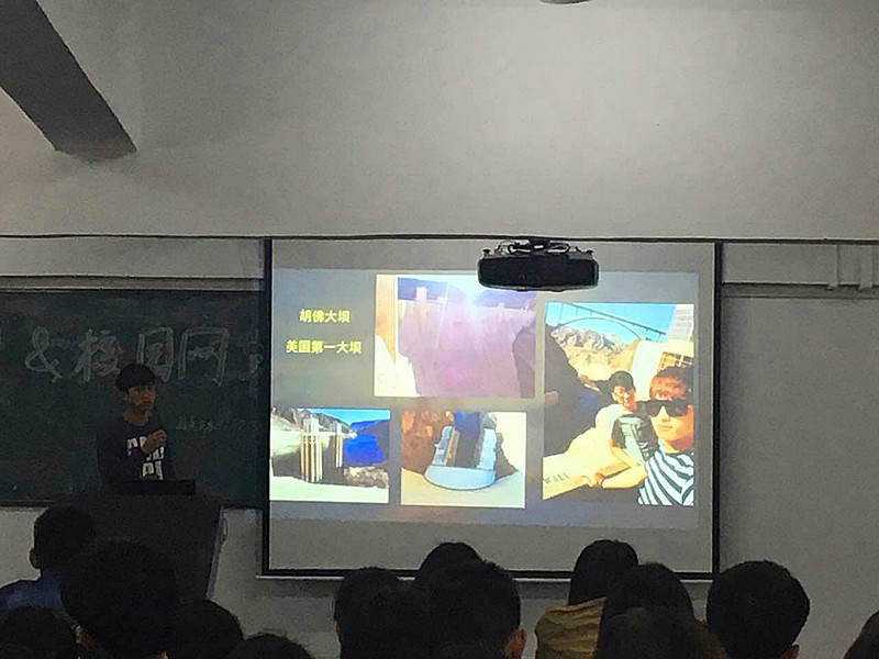 江武师兄认真地向同学们介绍赴美带薪实习项目,通过图片跟同学们讲解出发前的准备,让同学们更加深入地了解这个项目并开解同学们心中的疑惑。展示自己在IOWA 州 OKOBOJI唯一的麦当劳中全英文的环境里当服务员以及工作之余到处旅游的照片给同学们,让同学们真切地体验了一次完美的赴美带薪实习之旅。