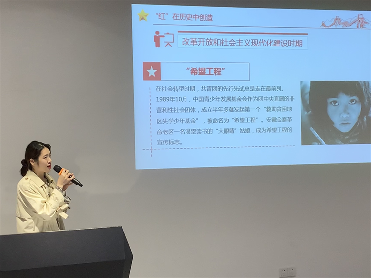 在演讲过程中,吴琳慧同学分别从横向和纵向两个维度加以具体事例分析来讲述在各个时间段各个方面中国青年是如何致力于祖国的建设和发展的。他们是如何创造和践行中国“红”的。首先吴琳慧同学分别从新民主主义革命时期,社会主义革命和建设时期,改革开放和社会主义现代化建设时期来阐述红色精神是如何在历史中创造的。其次通过科技、强军、抗疫、扶贫领域来说明中国青年是如何在时代中继承红色精神的。最后提出我们应该在现实生活中将红色精神内化于心外化于行。在演讲过程中,引用名人名言加深同学们的理解,通过视频播放强化同学们的印象,观众积极参与其中传达身边中国红故事,讲坛达到了预定效果。