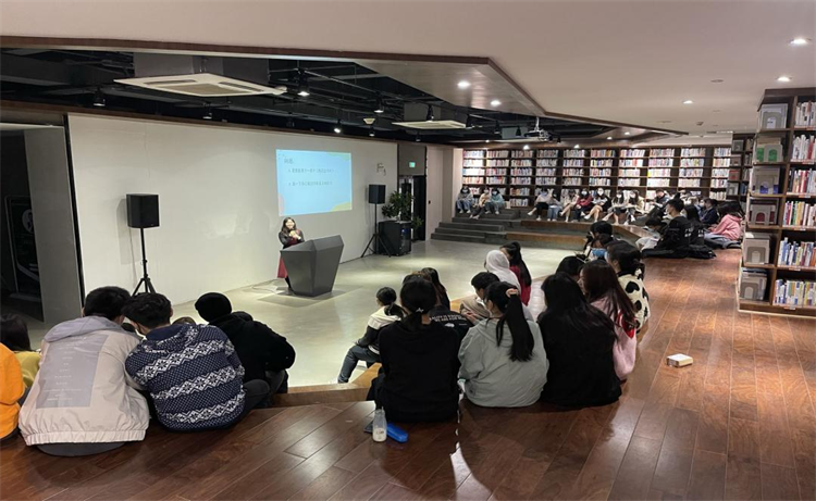 在讲坛上,冯海儿同学凭借自身优秀的演讲技巧,以“大家手机屏幕的使用时间”作为问题,与在场的同学进行了开场互动。随着同学们的回答,冯海儿同学引出了自己今晚的主题-谈读书。她首先谈到了现代的人们对于手机的依赖程度,用ppt展示了她自己做的小调查,一天使用手机超过6小时的人数占调查人数的79.61%。这一数据让在座的同学们很是感慨。接着冯海儿同学给大家介绍了一些她看过的小说,如《哈利波特》、《长安十二时辰》一类受欢迎的销量小说。其通过书中细节的介绍,对比根据小说所拍的影视作品,展示了小说的真正魅力,引起在座的同学们的惊叹。最后,她分享了“怎么读书”,建议同学们“放下手中的电子产品,感受一下,闲暇时,一壶茶一杯奶茶,纸的清香,纸张的触感,翻页的沙沙声,阅读实实在在捧在手里的书”,这是多么惬意的闲暇时光。