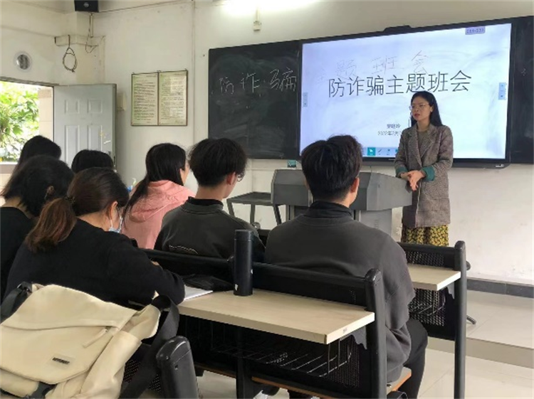 辅导员老师首先通过PPT向同学们介绍了常见的诈骗手段。比如:通过微信朋友圈、微博私信等平台,诱导学生参加抽奖活动、充值返利活动等;利用手机短信发送虚假消费提示或中奖提示,或者诱骗客户拨打假冒的银行服务电话、银联信用卡管理中心、公安部门等部门的咨询电话,套取客户的银行卡、密码等信息进行诈骗;还有冒充公检法人员、辅导员老师等进行诈骗;除此之外,游戏充值、快递理赔、网上交友、签订虚假公司合同、高价购买辅导课程或者高利息放款等,这些都是学生们容易上当受骗的诈骗方式。并且提醒同学们,不要认为“我没钱,就不会被骗”,因为骗子会诱导学生去一些常用网络平台上进行借贷,所以任何一个人都不能掉以轻心。