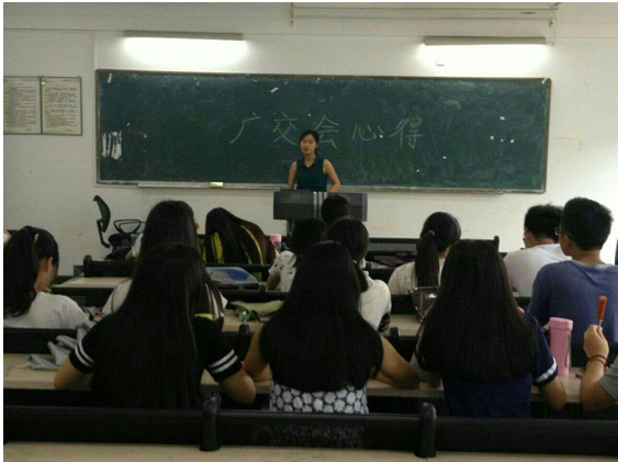 14级外贸与报关一班在1203召开了“广交会实习心得交流”班会,此次班会邀请了辅导员参加,本次班会大概流程为参与广交会同学分享实习心得、同学问答、总结三个流程。当实习生们站在台上分享,逐渐将我们对实习过程的期待解开,她们的经历填满了同学们的想象空间。有人从他们的工作出发,分享一天天的工作流程并对每项工作做出总结和分享自己的小技巧;有人用简短的语言总结整个实习时期。总来得说,这次实习是非常有意义的,也在这期间很好地检验了自己的口语能力,并学会了吃苦耐劳,学会合作,实习生普遍反映出自己的口语能力需要加强锻炼,希望在下一次能在展现自己的舞台上发挥出最好的水平。