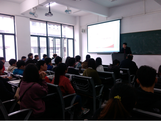 招聘现场同学们认真听讲,并有不少同学勇跃提问。荣鑫公司肖书记与同学们互动气氛热烈。